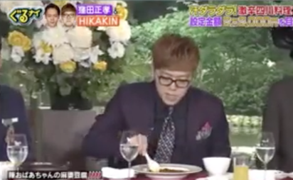 7月11日、「ぐるぐるナインティナイン」看板コーナー「グルメチキンレース・ゴチになります!」を放送、VIPチャレンジャーにユーチューバーのHIKAKINがゲスト出演。高級料理に舌鼓を打ったが、ネット上では「食べ方が汚い」との批判を受けた。 今回、一行が堪能したのは激辛四川料理。白金台の4つ星ホテル『シェラトン都ホテル東京』の中華レストラン『四川』を舞台に、設定金額2万2000円で本格四川料理をオーダーしていった。 HIKAKINが最初に注文したのは、およそ150年前に初めて作られたとされる際のレシピを再現した麻婆豆腐。 しかし、高級レストランでの食事にもかかわらず、水平に握ったレンゲを口に近付け、口に入れながら「熱い!」と叫ぶ品のなさをいきなり見せつけてしまう。 さらに、左手は終始テーブルの下から出さないという、基本的な行儀の悪さも披露してしまった。 その後に注文したデザートでも、HIKAKINはレンゲを持ち上げず顔の方から寄せていくように食べていき、きちんと口元に運んでいった土屋太鳳との差が鮮明に浮かび上がる形に。ツイッター上にも、 《HIKAKIN食べ方ちょっと汚い…》 《レンゲの持ち方と食べるときに左手下げたままが気になる》 《HIKAKIN食べ方が汚いよ》 《子どもがめっちゃヒカキン好きだから、ちょっと残念》 《ヒカキン、食べ方がちょっと不快》 などといった感想が上がっており、幻滅した視聴者も多かったようだ。 動画編集が忙しく、日頃の食事はコンビニ弁当やデリバリーが多いというHIKAKIN。トップユーチューバーとしてかなりの稼ぎを得ているものの、金で品は買えないことを証明してしまった。 http://dailynewsonline.jp/article/1924165/ |